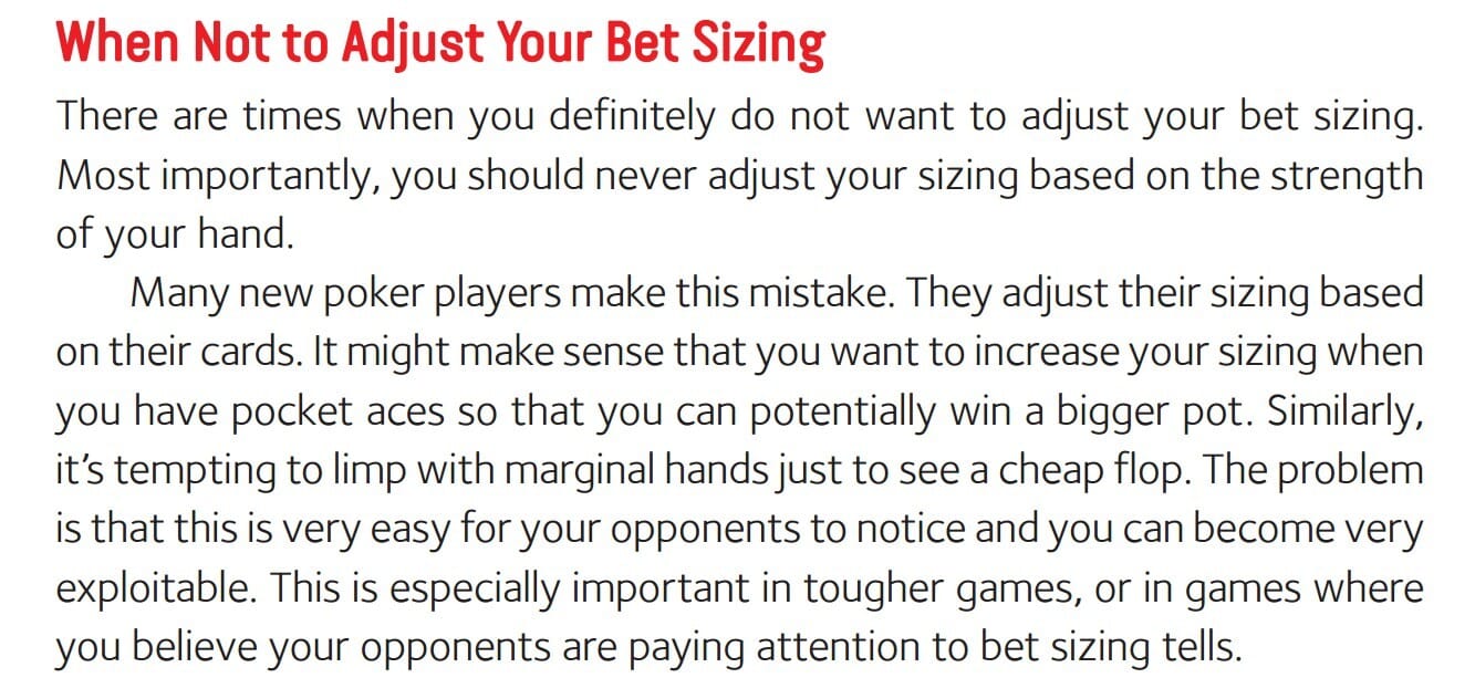 There are legitimate reasons to adjust bet sizing—but they should be based on board texture, stack sizes, opponent tendencies, and position. Never based on your actual cards. On a wet, coordinated board, you might bet larger to charge draws. Against a calling station, you can size up your value bets because they'll call anyway. But you make these adjustments for strategic reasons, not because you happen to have pocket aces this time.