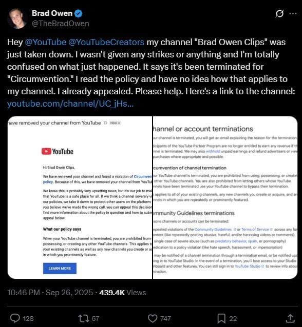 Brad Owen’s channel "Brad Owen Clips" was taken down by YouTube and has since been reinstated.