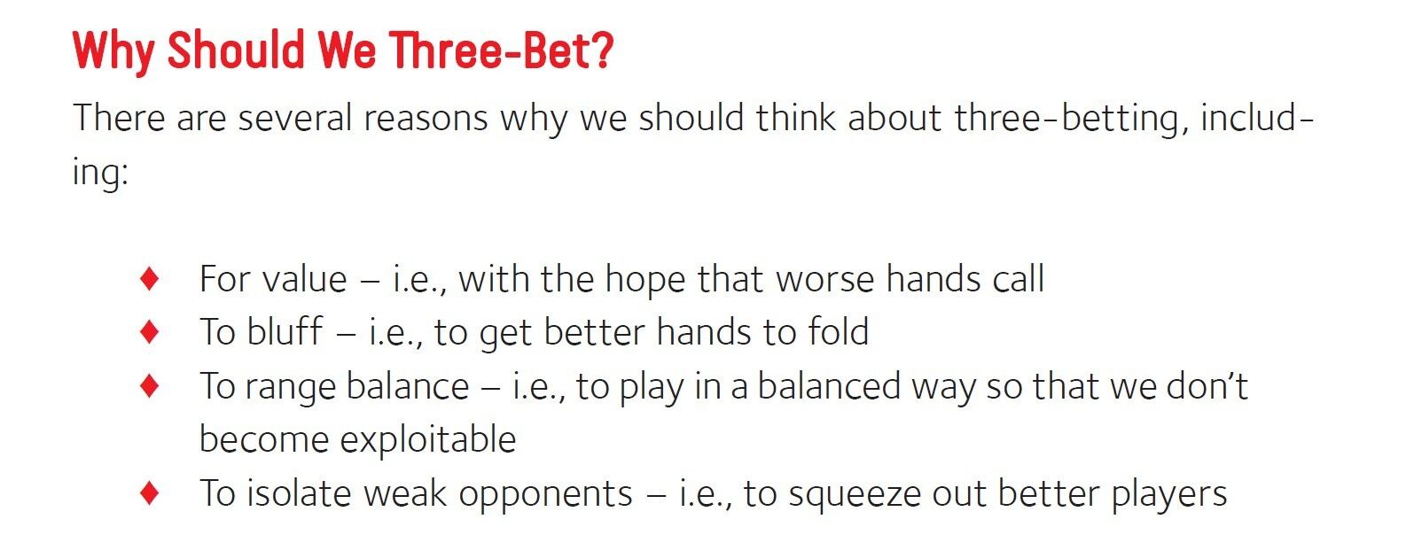 In my book, I mention that the three-bet serves multiple purposes that go way beyond just building pots with premium hands. When you three-bet from position, you're putting tremendous pressure on your opponent's opening range, forcing them to make difficult decisions with all their marginal holdings. Most players will fold way too often to three-bets, which means you can profitably three-bet with a polarized range that includes both your absolute monsters and strategic bluffs.