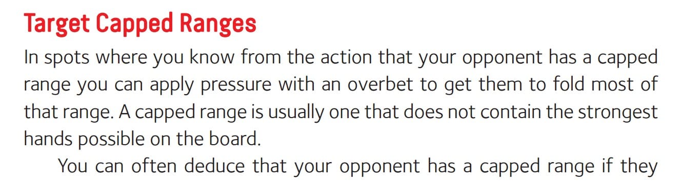 In my book, I dive deeper into how to use overbets to exploit capped ranges—opponents who can't have the nuts based on their previous actions. When you know they're capped, overbetting becomes even more powerful.